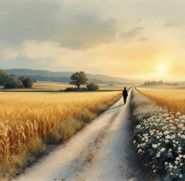 Die Sonne war untergegangen, aber der Himmel leuchtete noch in zartem Rosa und Violett, und über den Feldern lag eine Stille, die nur von fernen Geräuschen durchbrochen wurde. Ein Hund bellte irgendwo, eine Tür fiel ins Schloss, und aus einem Garten hörte er das Lachen von Kindern, die noch draußen spielten.