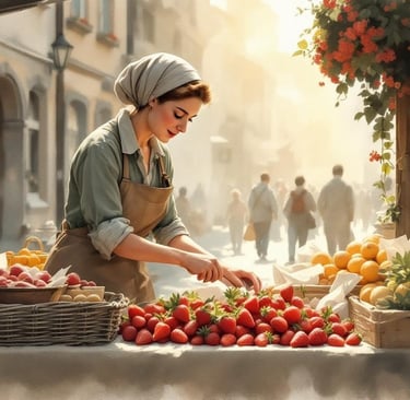 Diese Vorlesegeschichte für Senioren entführt auf einen lebhaften Wochenmarkt im Frühsommer der 1950er Jahre, wo der Duft frischer Erdbeeren und geschäftiges Treiben die Sinne wecken.
